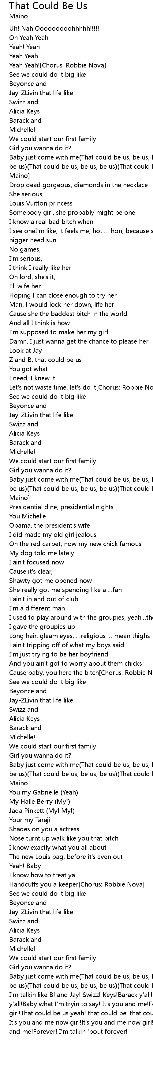 | Baby just come with me That could be us, be us, be us That could be us, be us, be us That could be us, be us, be us That could be us, be us, be us Verse 1: Maino | |