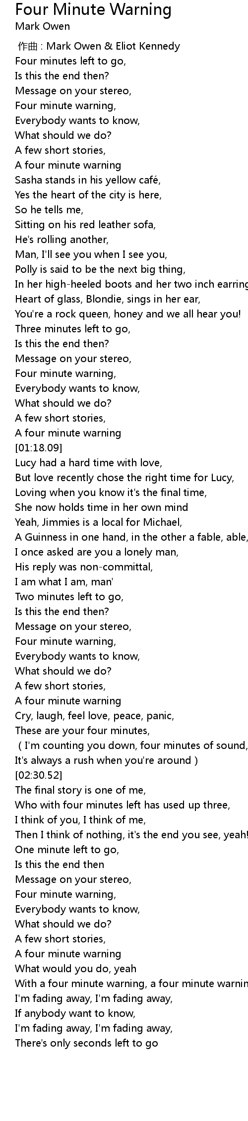 | [03:20.59] | With a four minute warning, a four minute warning, |