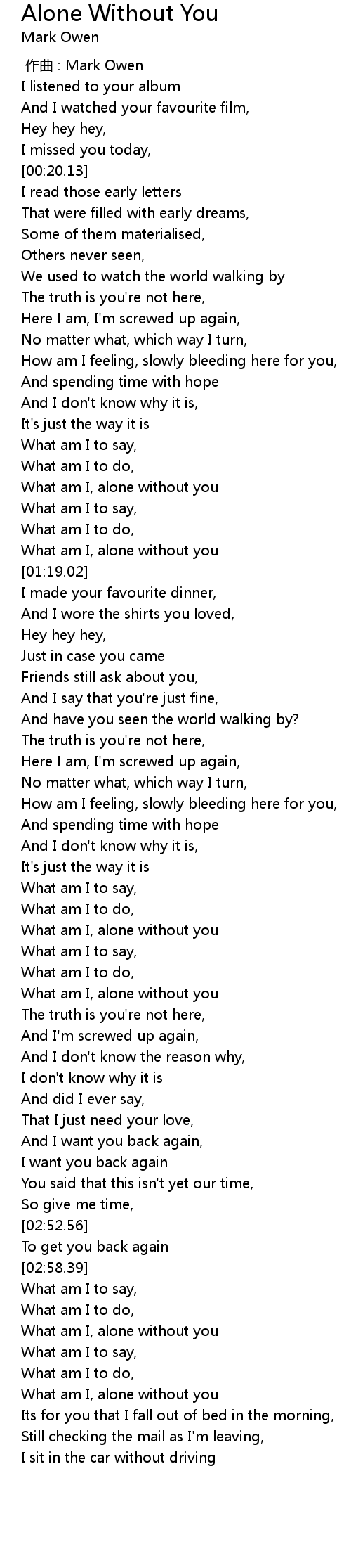 | [03:21.36] | What am I, alone without you |