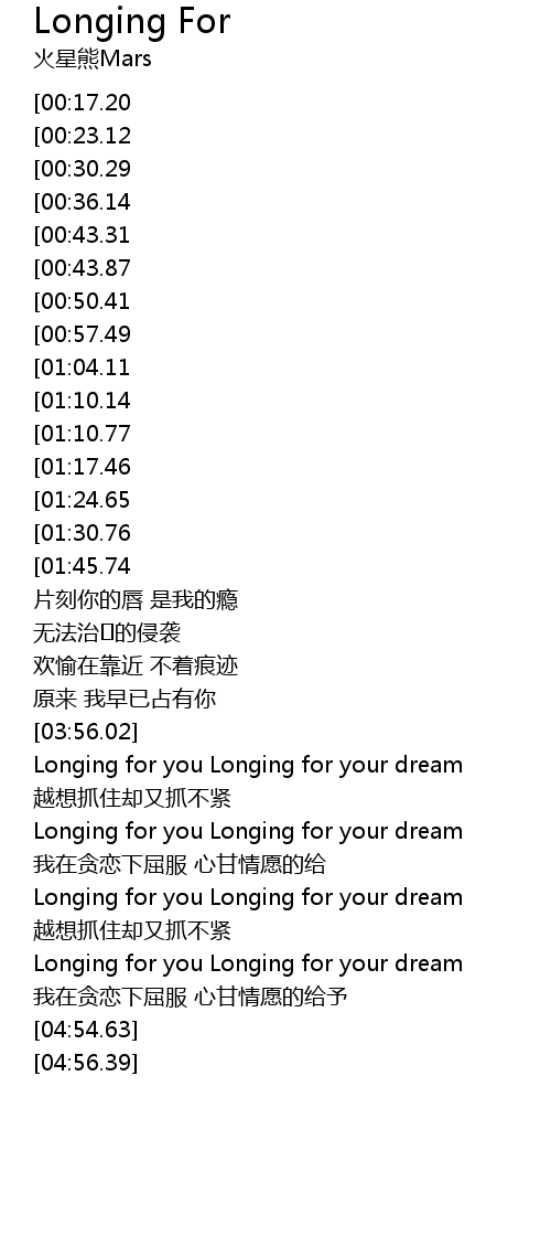| [03:01.59][01:10.77] | Longing for you Longing for your dream |