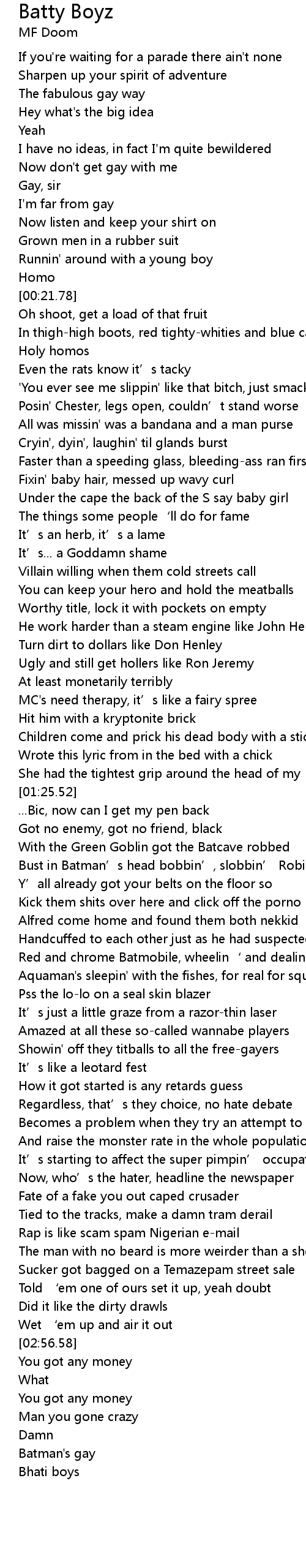 | [01:49.81] | Bust in Batman’s head bobbin’, slobbin’ Robin’s knob |