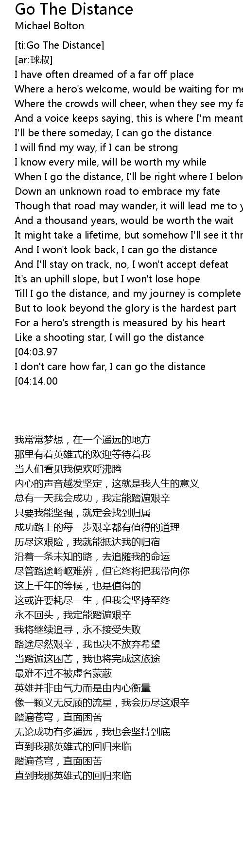 | [01:14.00] | When I go the distance, I' ll be right where I belong |