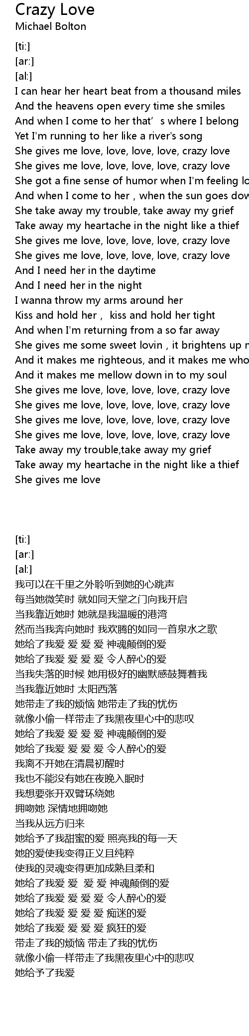 | [02:19] | She gives me love, love, love, love, crazy love |