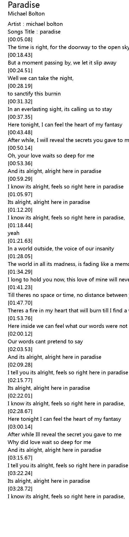 | [02:22.95] | I know its alright, feels so right here in paradise, |