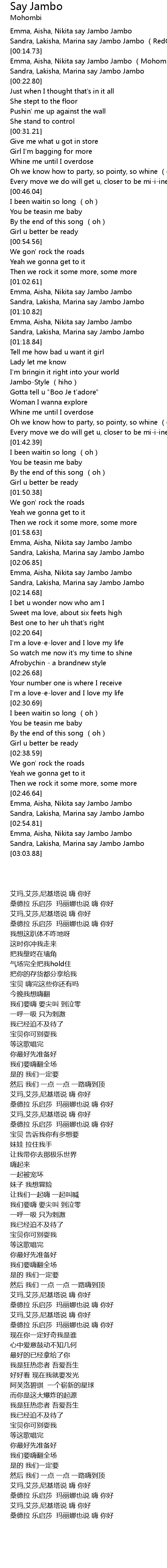 | [00:15.73] | Emma, Aisha, Nikita say Jambo Jambo Mohombi |