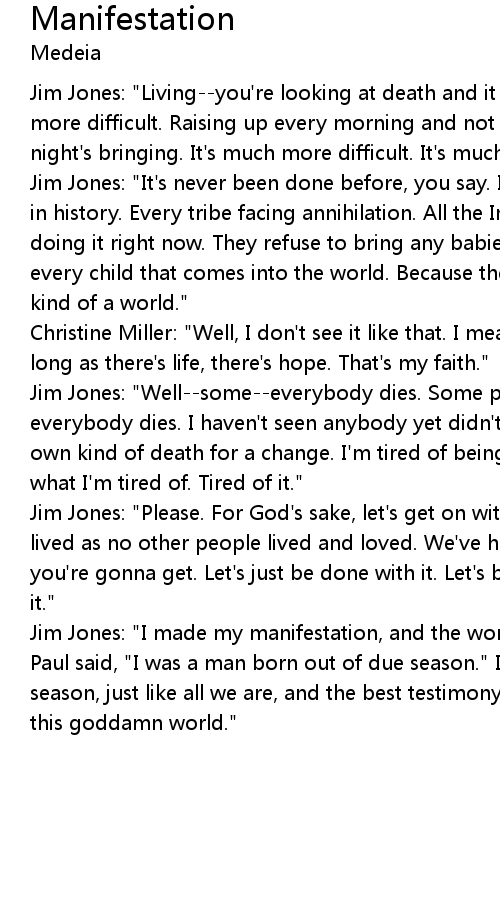 | Jim Jones: "I made my manifestation, and the world was ready, not ready for me. Paul said, "I was a man born out of due season." I've been born out of due season, just like all we are, and the best testimony we can make is to leave this goddamn world." |