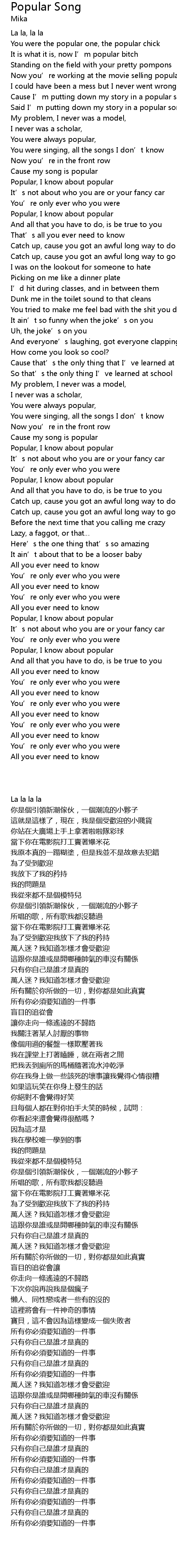 | 歌曲 | Popular Song |