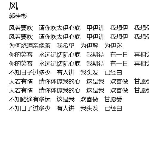 | fēng ruò yào chuī qǐng nǐ chuī qù yī xīn dǐ jiǎ yī jiǎng wǒ xiǎng yī wǒ xiǎng yī | |