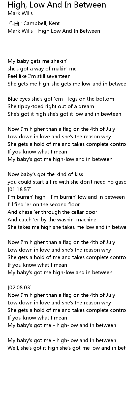 | [01:04.69] | My baby's got me high-low and in between |