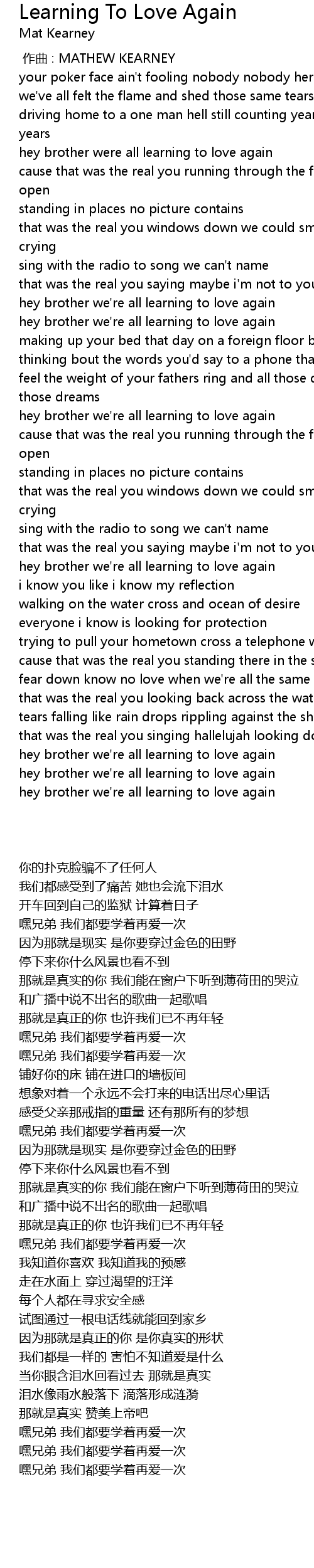 | [01:58.890] | 嘿兄弟 我们都要学着再爱一次 |