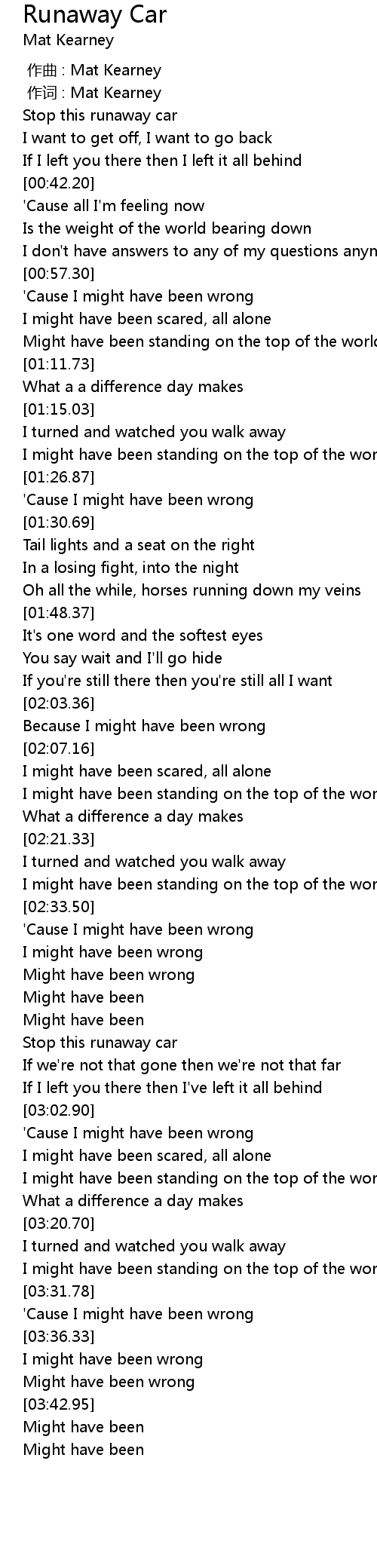| [00:29.75] | Stop this runaway car |