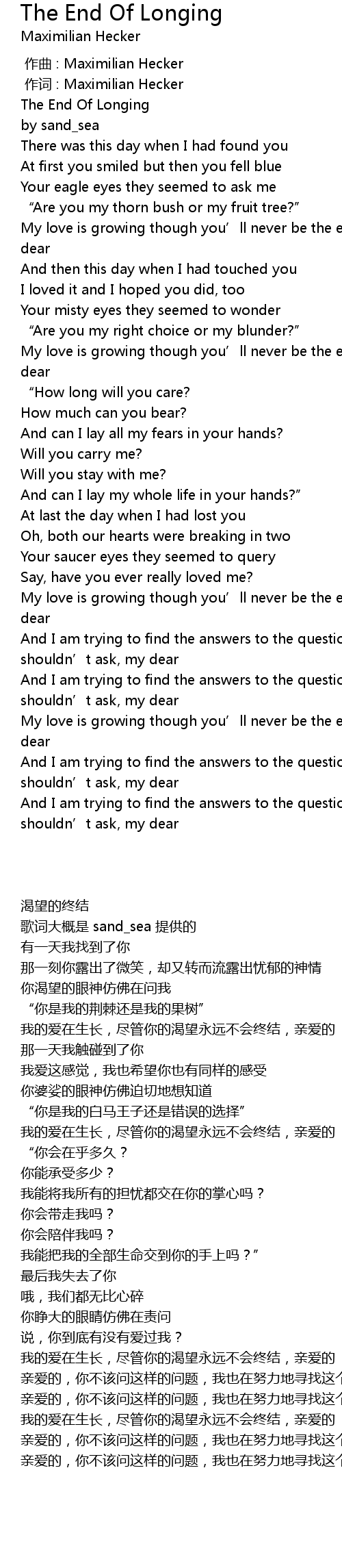 | [03:21.37] | My love is growing though you' ll never be the end of longing, my dear |