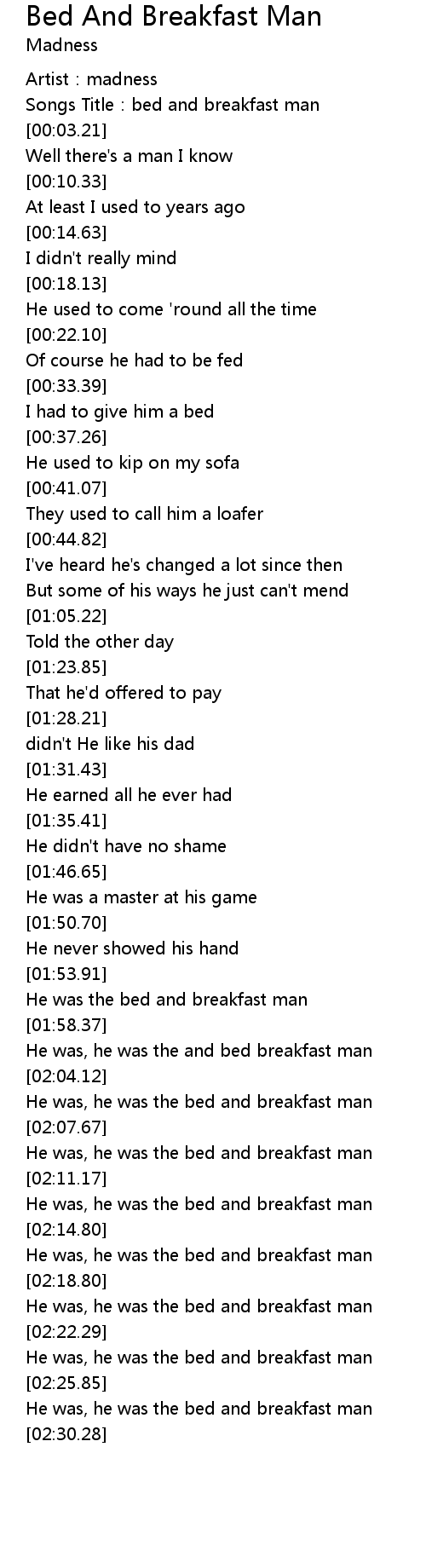 | [01:55.78] | He was the bed and breakfast man |