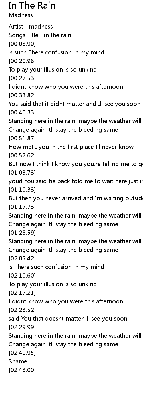 | [00:42.38] | Standing here in the rain, maybe the weather will change again |