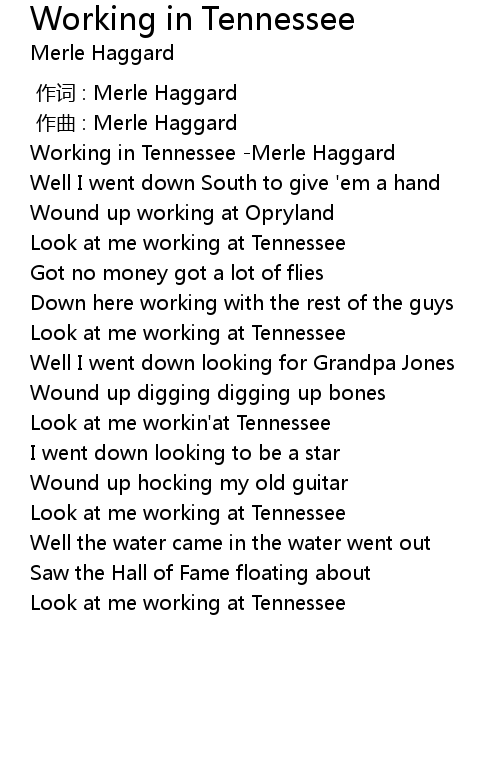 | [00:00.594] | Working in Tennessee Merle Haggard |