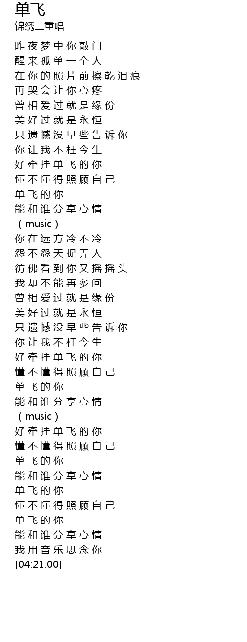 | [01:09.00] | 好 牵 挂 单 飞 的 你 |