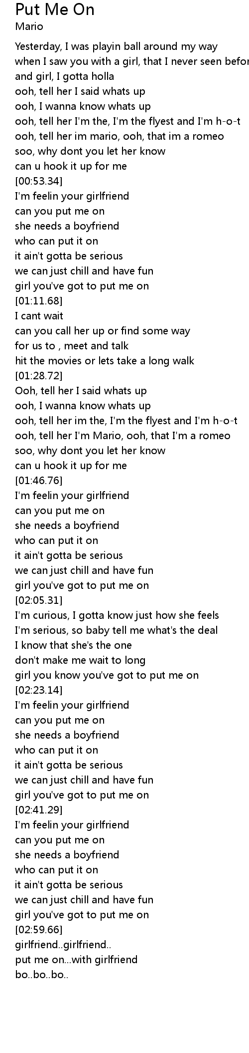 | [02:03.89] | girl you've got to put me on |
