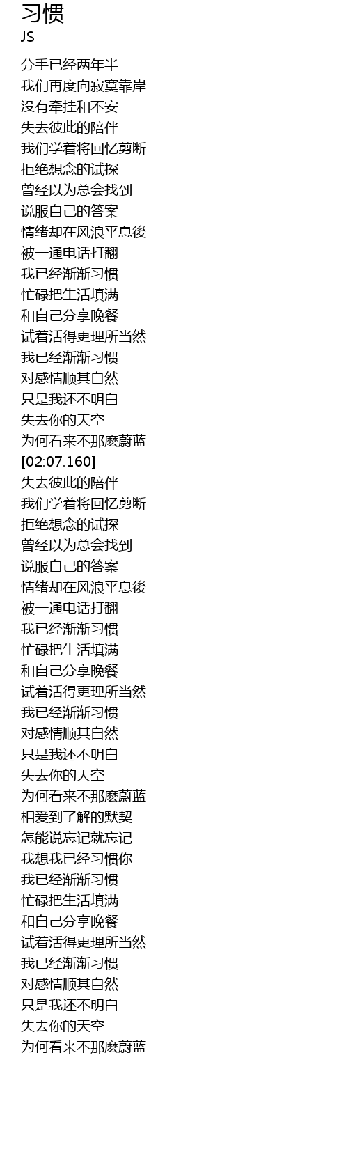 | [02:49.690] | wǒ yǐ jīng jiàn jiàn xí guàn |