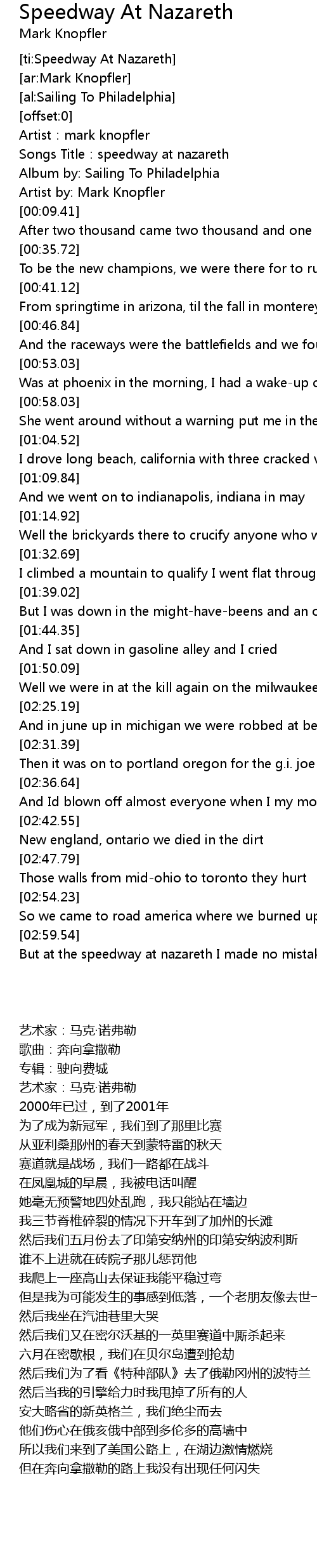 | [00:05.66] | Songs Title: speedway at nazareth |