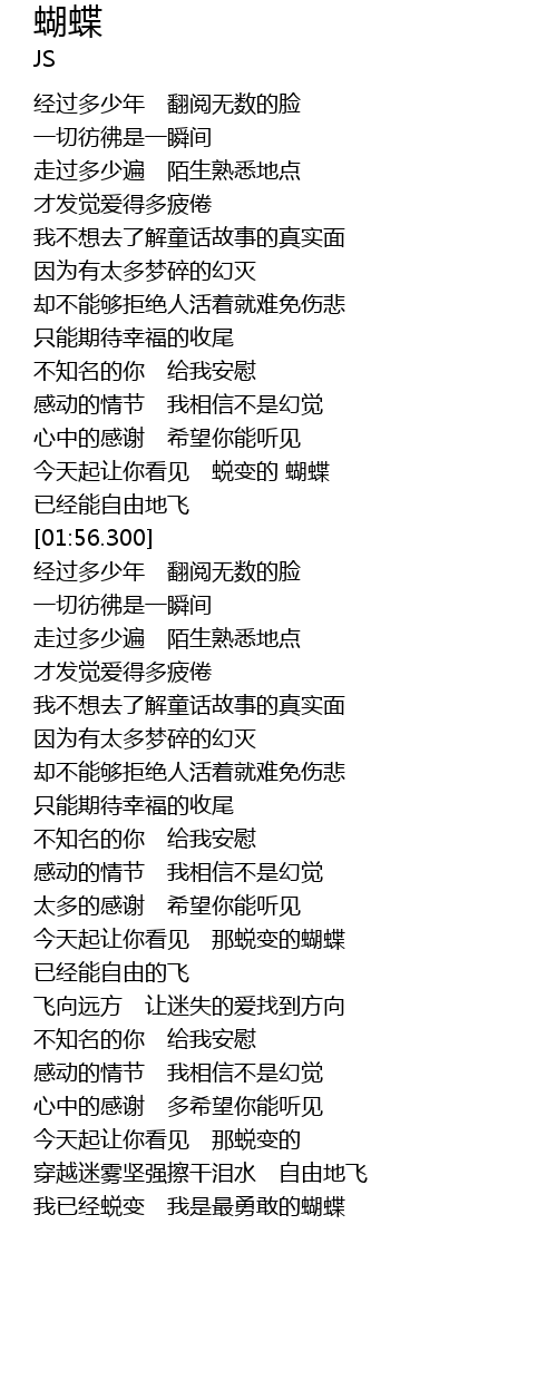 | [01:41.689] | 今天起让你看见 蜕变的 蝴蝶 |