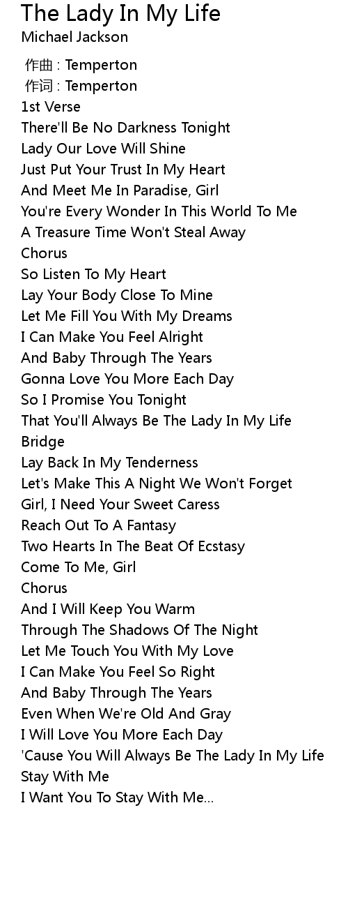 | [02:22.07] | ' Cause You Will Always Be The Lady In My Life |