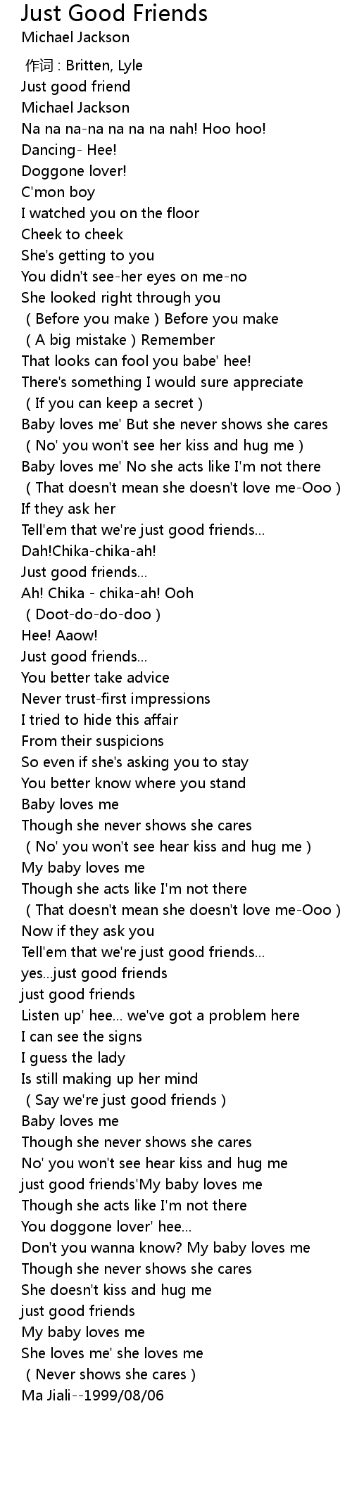 | [03:06.00] | just good friends' My baby loves me |