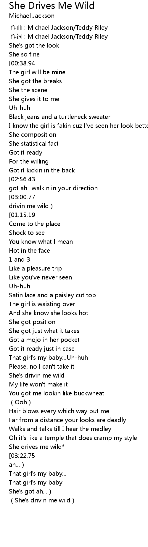 | [03:09.41][03:00.77][02:52.01][02:42.71][01:58.95][01:06.36] | She's got ah...she's drivin me wild) |
