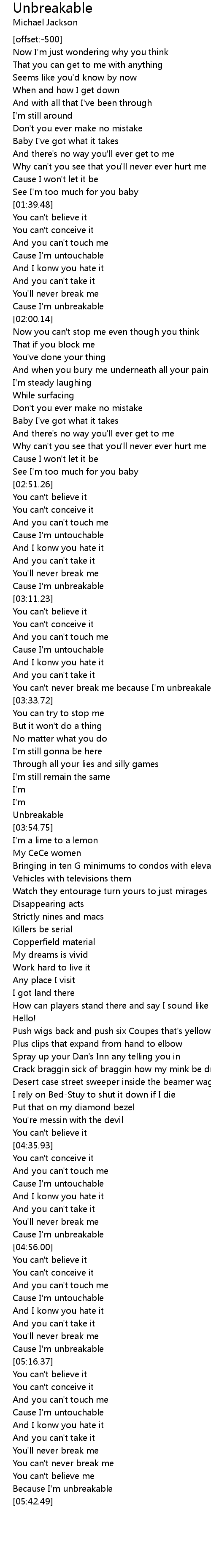 You can't never break me because I'm unbreakale |