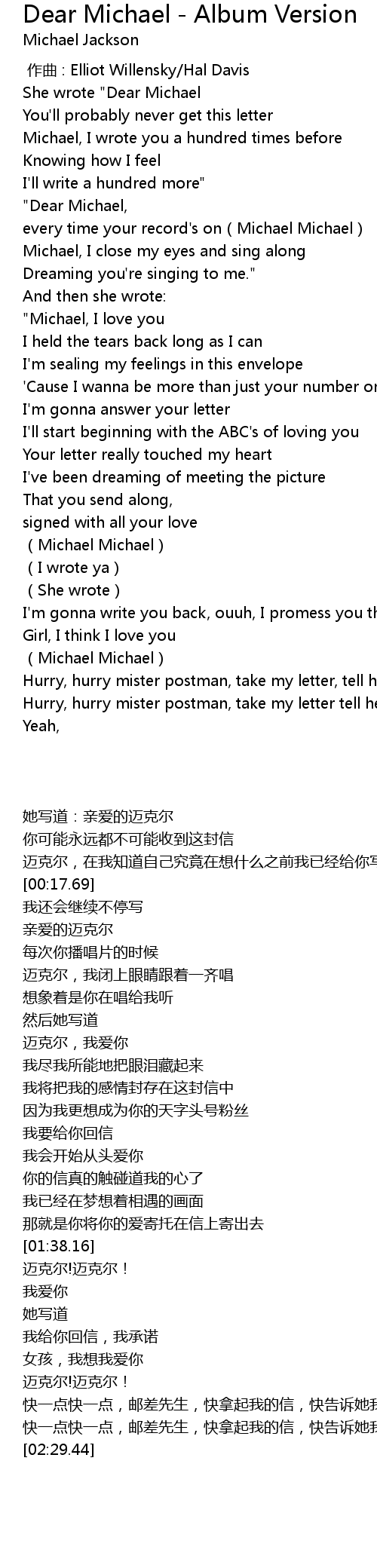 | [00:01.41] | She wrote "Dear Michael |