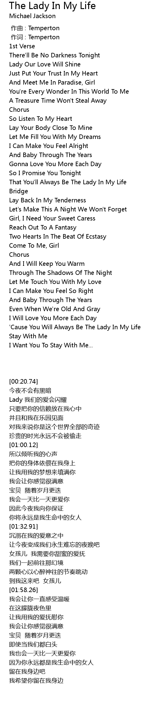 | [02:20.87] | ' Cause You Will Always Be The Lady In My Life |