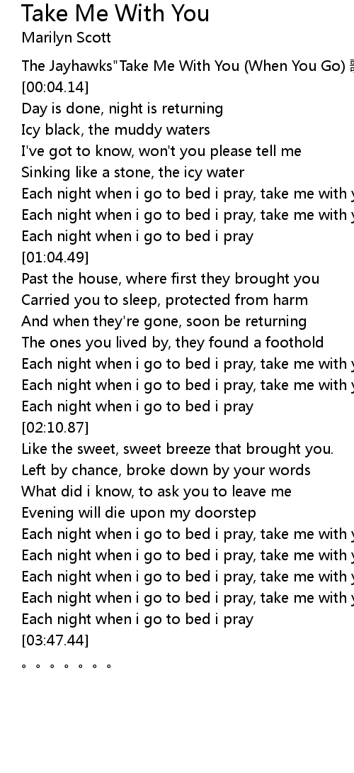 | [01:51.01] | Each night when i go to bed i pray, take me with you when you go |