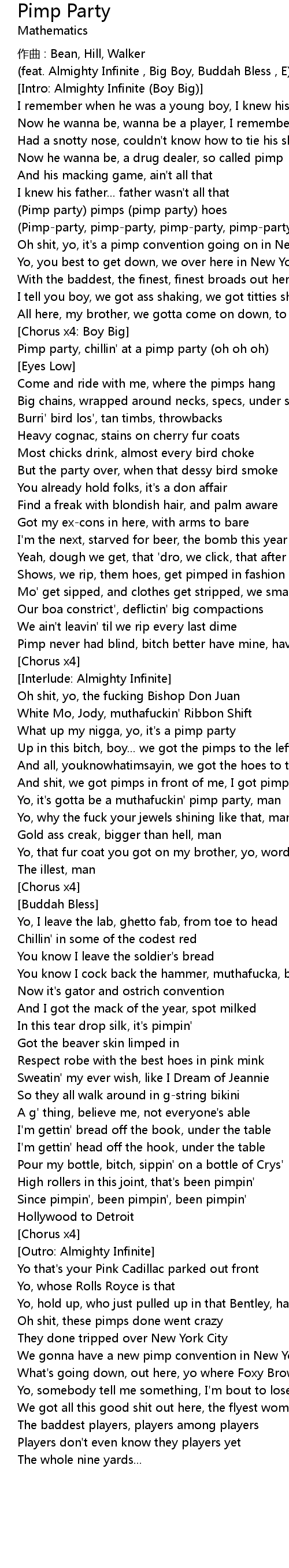 | Pimp party, chillin' at a pimp party oh oh oh | |