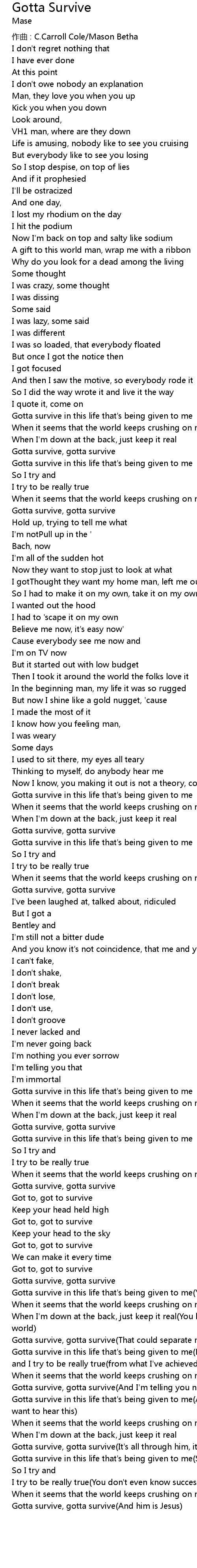 | Gotta survive in this life that's being given to me(From what I believeSo I try and I try to be really true(from what I've achieved) | |