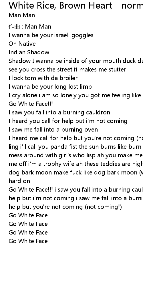 | Go White Face!!! i saw you fall into a burning cauldron i heard you call for help but i'm not coming i saw me fall into a burning oven i heard me call for help but you're not coming (not coming!) | |