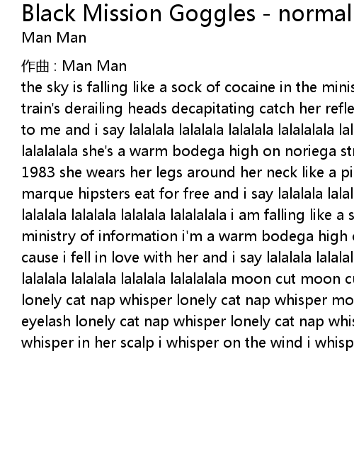 | the sky is falling like a sock of cocaine in the ministry of information subway train's derailing heads decapitating catch her reflection and it seems to sing to me and i say lalalala lalalala lalalala lalalalala lalalala lalalala lalalala lalalalala she's a warm bodega high on noriega strung out in brooklyn like it's 1983 she wears her legs around her neck like a piece of ice her smile's a neon marque hipsters eat for free and i say lalalala lalalala lalalala lalalalala lalalala lalalala lalalala lalalalala i am falling like a sock of cocaine in the ministry of information i'm a warm bodega high on noriega strung out in brooklyn cause i fell in love with her and i say lalalala lalalala lalalala lalalalala lalalala lalalala lalalala lalalalala moon cut moon cuts tiny like eyelash lonely cat nap whisper lonely cat nap whisper moon cut moon cuts tiny like eyelash lonely cat nap whisper lonely cat nap whisper and i walk around i whisper in her scalp i whisper on the wind i whisper once again |