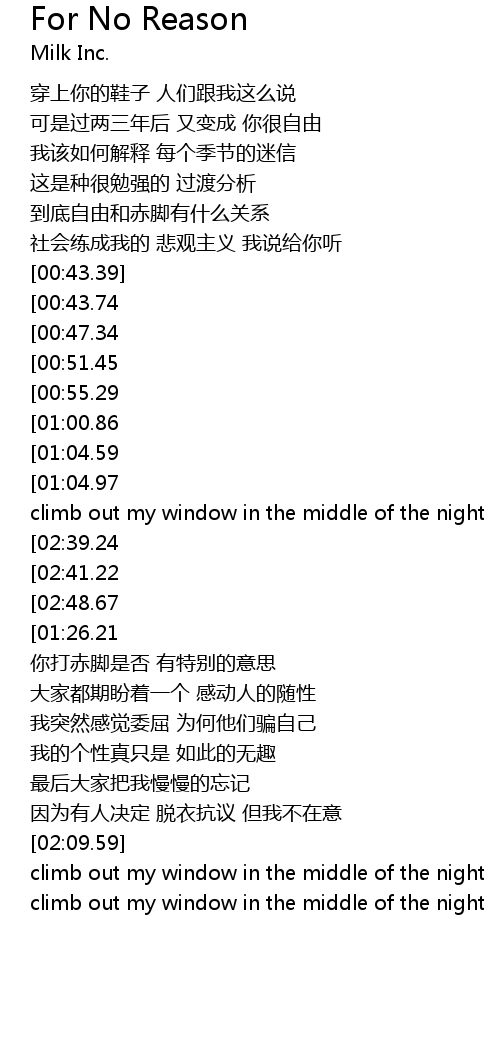 | [03:36.00][02:41.22][01:15.92] | 我们要乱跳舞 不需要理由 |