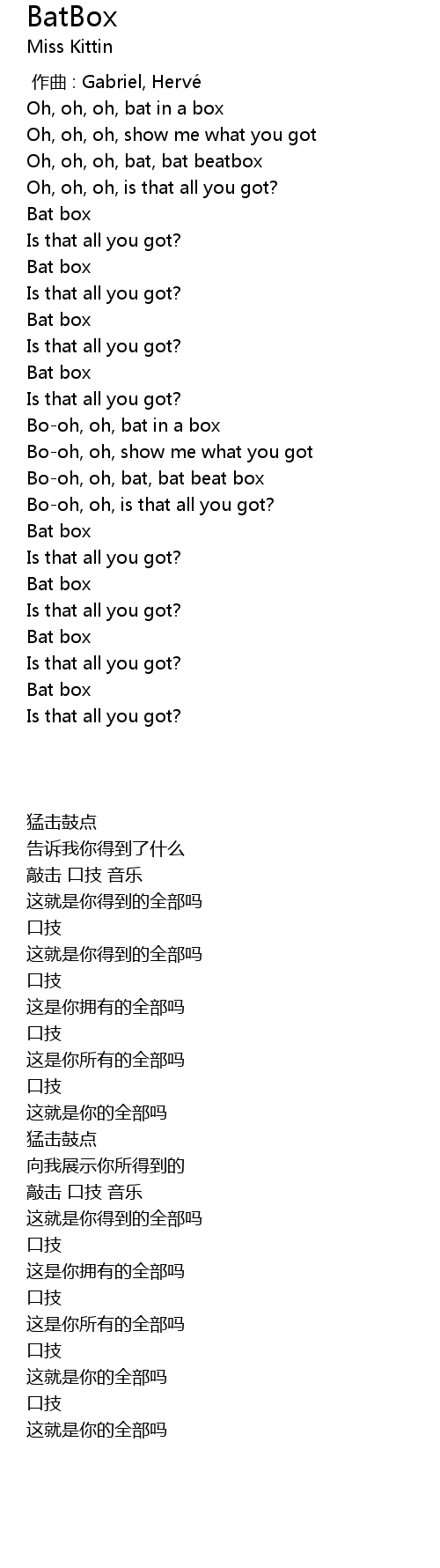 | [00:32.00] | Oh, oh, oh, bat, bat beatbox |