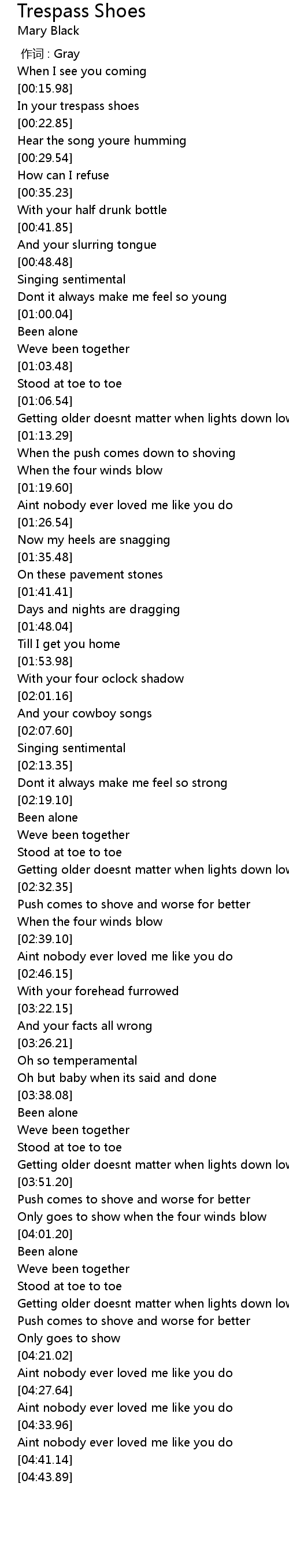 | [00:20.04] | In your trespass shoes |