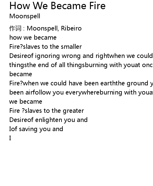 | Fire? when we could have been earththe ground you sleep, rest inwhen we could have been airfollow you everywhereburning with youat once the graceand the cursehow we became | |