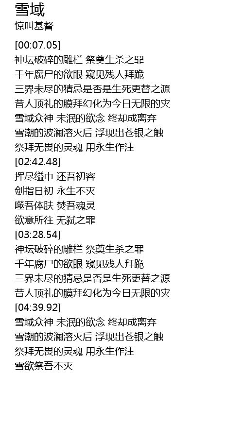| [04:10.59] | 神坛破碎的雕栏 祭奠生杀之罪 |