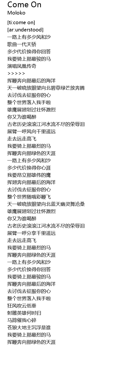 | [04:30.719] | wǒ yào qí shàng nà zuì liè de mǎ |