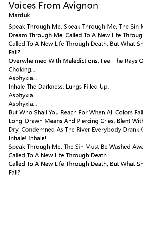| Speak Through Me, The Sin Must Be Washed Away With Blood, Dream Through Me, Called To A New Life Through Death | |