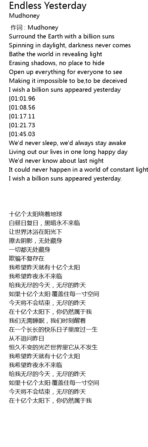 | [03:18.80][01:21.73] | Today would be endless, endless, endless yesterday |