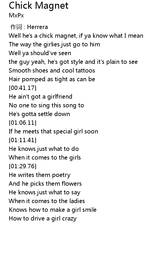| [00:17.84] | Well he' s a chick magnet, if ya know what I mean |