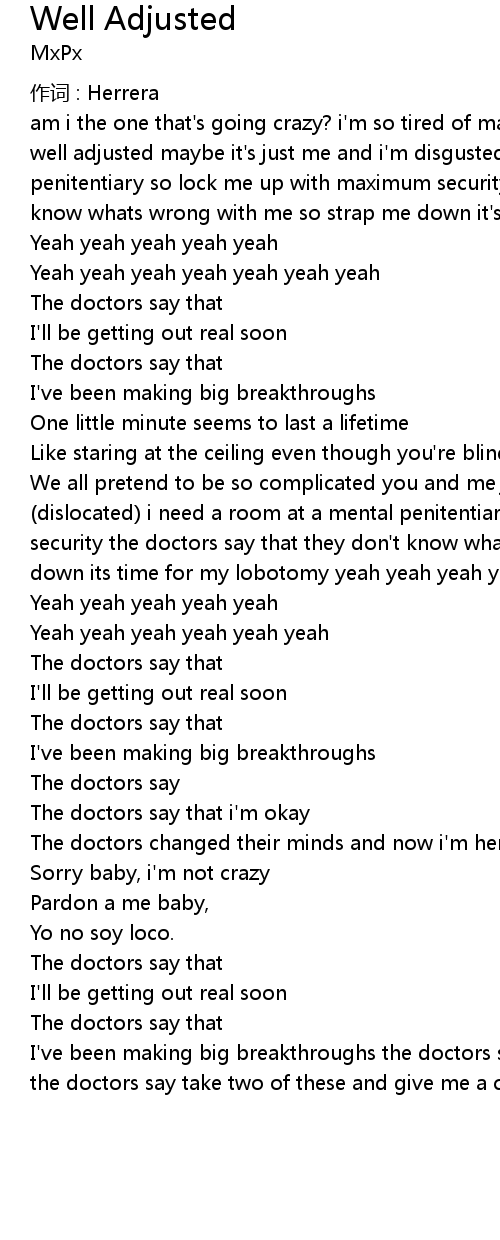 | We all pretend to be so complicated you and me just may be dislocated dislocated i need a room at a mental penitentiary so lock me up with maximum security the doctors say that they don' t know what' s wrong with me so strap me down its time for my lobotomy yeah yeah yeah yeah yeah yeah yeah yeah yeah yeah | |