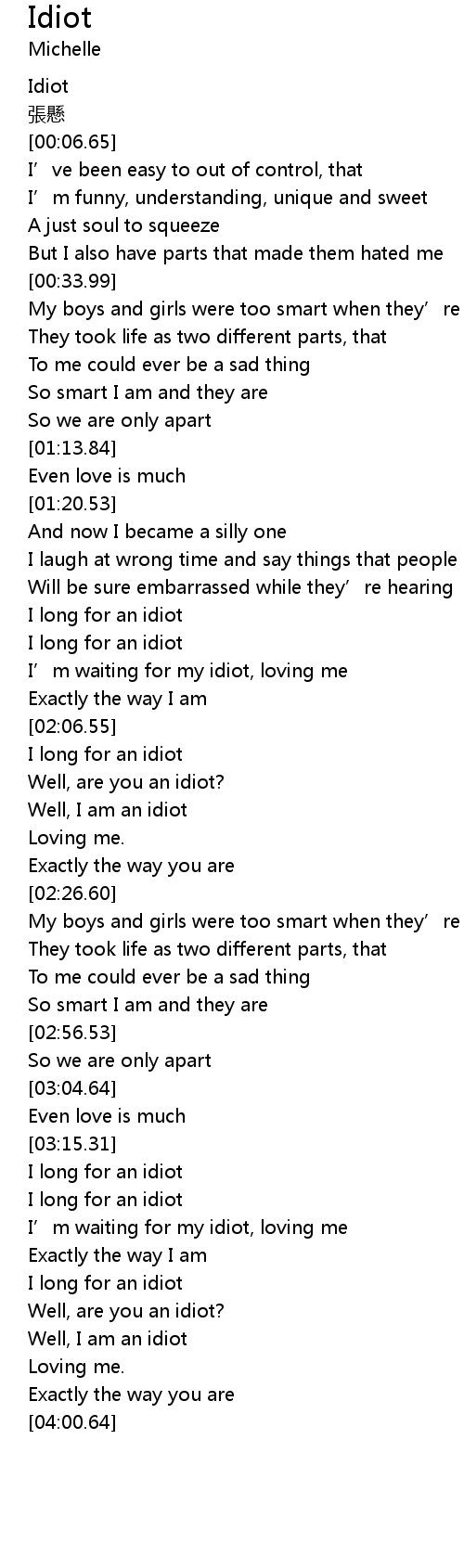 | [03:25.84] | I’m waiting for my idiot, loving me |