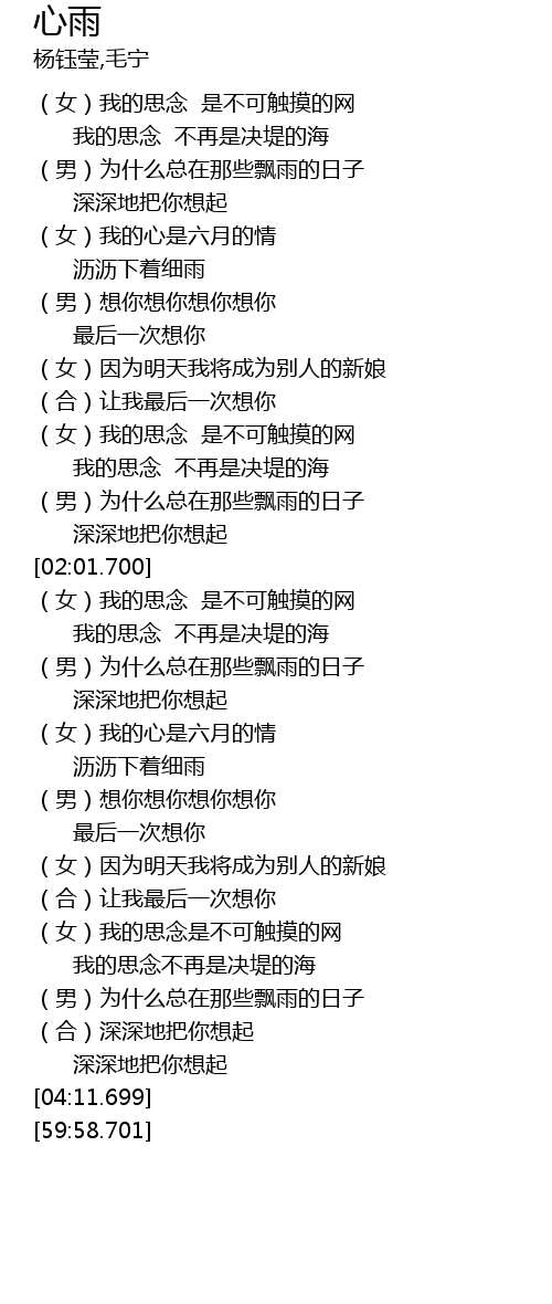 | [01:01.700] | nán xiǎng nǐ xiǎng nǐ xiǎng nǐ xiǎng nǐ |