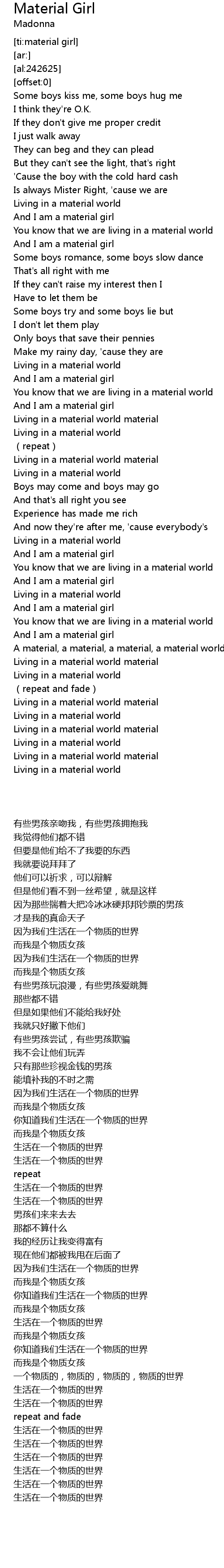 | [03:27.47] | A material, a material, a material, a material world |