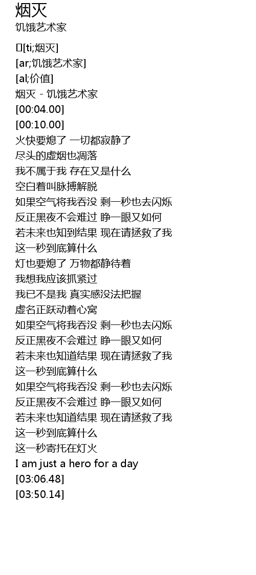 | [00:00.00] | 烟灭 - 饥饿艺术家 |