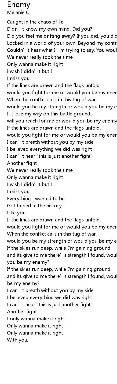 | and its give to me there’s strength I found, would stand with me or would you be my enemy? | |